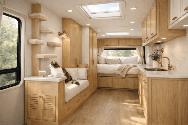 Custom camper van layout guidance centered on dogs and cats.